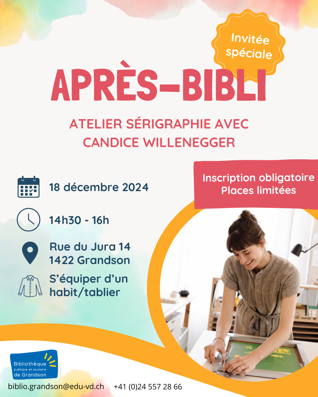 Envie de créer des impressions uniques ? Inscrivez-vous à l’après-bibli du 18 décembre pour un atelier exceptionnel avec Candice Willenegger ! Apprenez l’art de la sérigraphie dans une ambiance créative et conviviale.