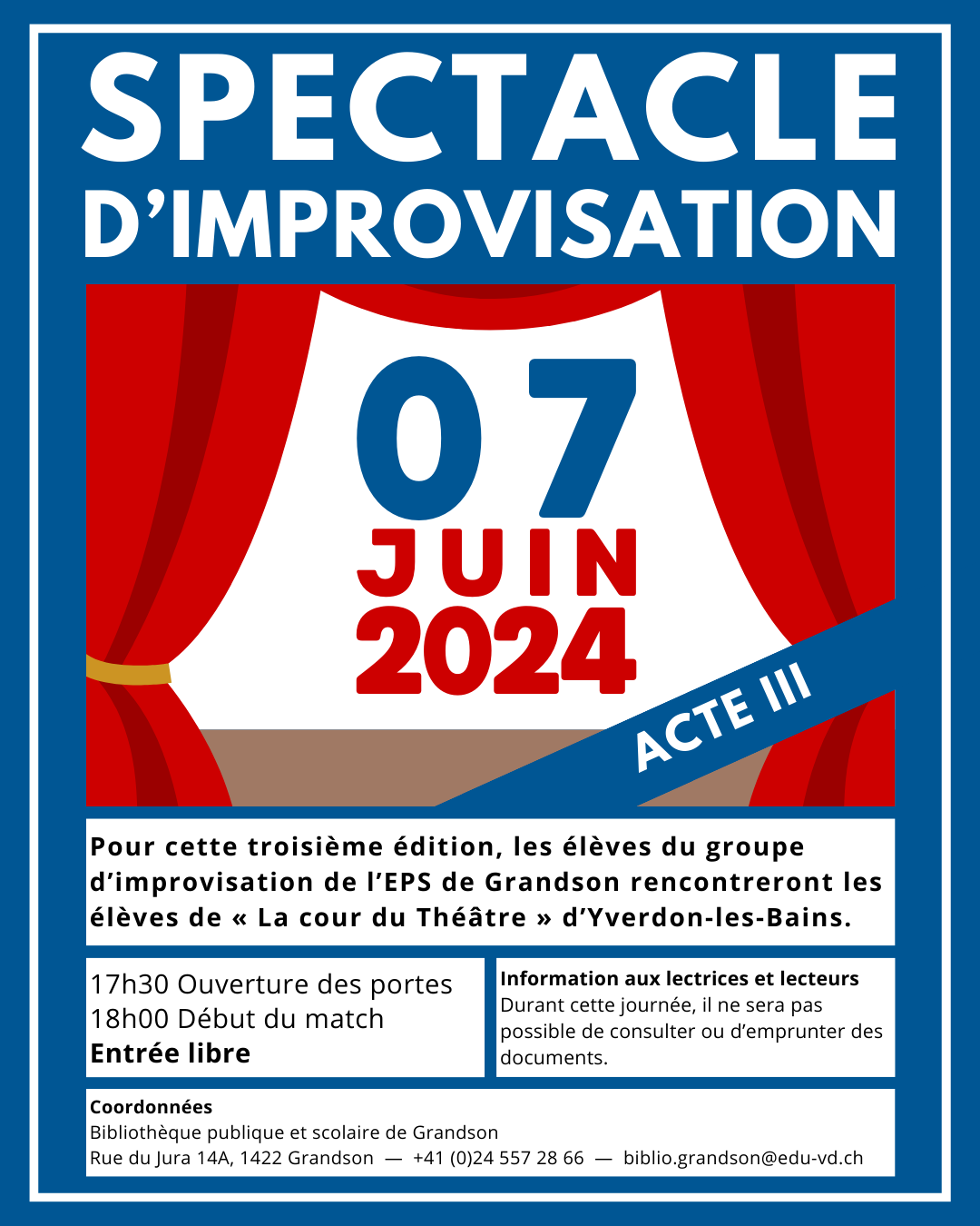 Après le succès rencontré lors de la soirée du mois de décembre dernier, votre bibliothèque se transforme, à nouveau, en salle de théâtre pour le groupe d’improvisation de l’EPS de Grandson!